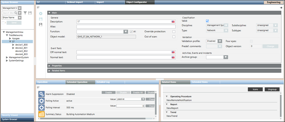 The S7 network workspace allows you to configure the network settings such as associating the S7 driver to the network and saving the association. The properties associated with the selected network display in the Operation tab or Extended Operation tab. You can also change the value of the poll interval. By default, this value is set to 0 ms. In order to delete the network, you must click Delete