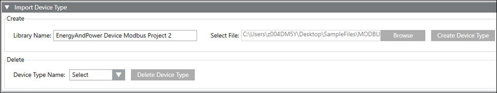 - Select File: Allows you to browse and select the JSON file to be used to create the device type.