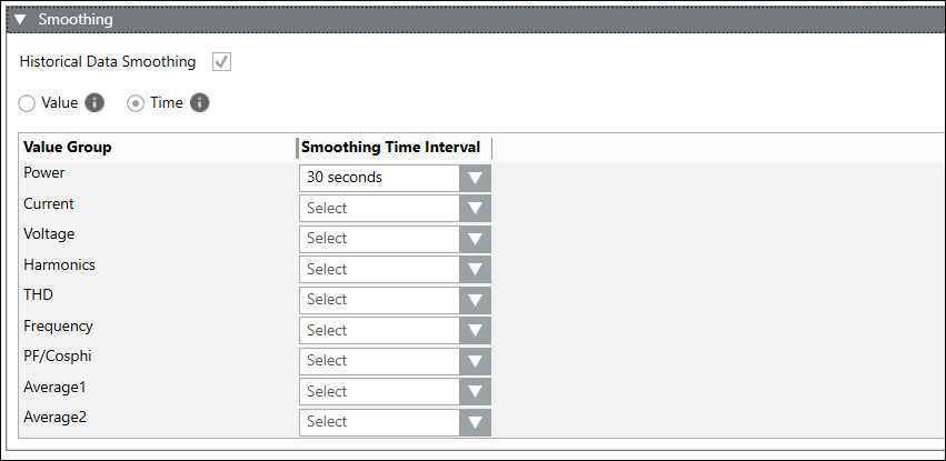 - Smoothing Time Interval: Allows you to select smoothing time intervals for the selected value groups.