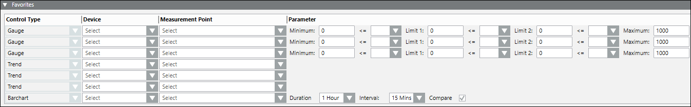 - Parameter: It allows to set the limits of the gauges and the color for the representing the corresponding measurement point. You can also select the time duration to be used in the bar chart.
