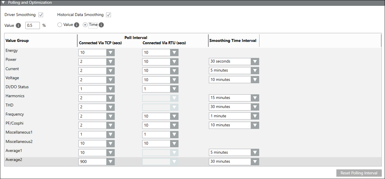 The powermanager application communicates with the devices by polling them at regular intervals. There are various poll groups defined; each of them having its own specific polling interval. You can configure the polling intervals using this expander. You can also configure driver smoothing and data smoothing in this expander. Smoothing is used to reduce the amount of communication and volume of data processed in the system. It reduces the communication load between drivers and other managers and the amount of data that is processed. The Poll interval is disabled by default with blank values. You can reset the polling intervals to their default values by clicking Reset.