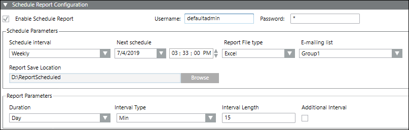 - Enable Schedule Report: Allows you to activate the configuration for routing the selected report to an email group or to a folder in the local memory.