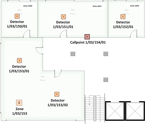 - 1/03/154/01 - One fire zone (1/03/153), parent object of two detectors: