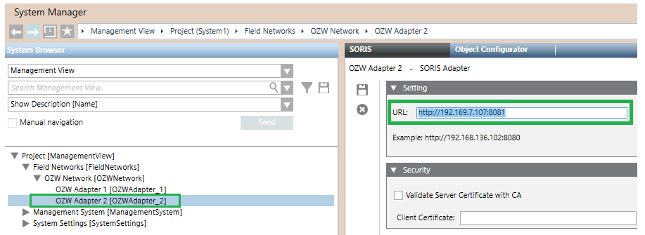 - In Desigo CC, in the URL field of the SORIS Adapter configuration, use the same IP address and the specific port according to the configuration defined for each adapter. For example:
