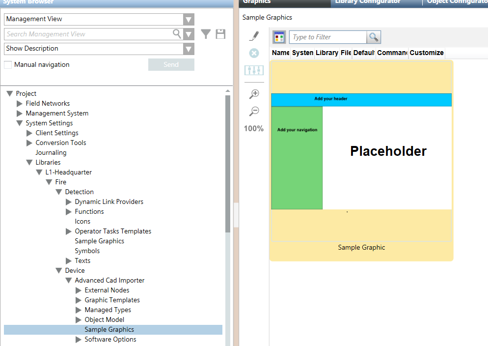 The advanced CAD import can be based on a sample graphic designed to contain the imported drawings. You can use an option in the import wizard to enable this feature and select a predefined sample graphic. A default sample graphics is stored in the following System Browser path: