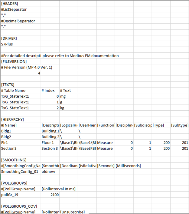 In order to create instances of S7 PLUS devices, you must create the engineering data in the form of a comma-separated value (CSV) file. A CSV file contains data in which values are represented as text and separated using a separator such as comma (,). The file in the CSV format can be edited in text editors such as Wordpad or Notepad. More elaborate editing can be done using advanced word processing tools, like Excel. A CSV file is divided into the following sections.