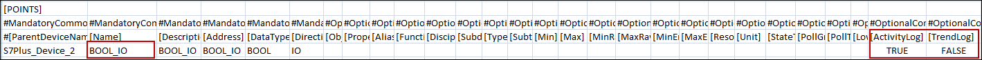 You can configure the activity and online trend logging for a point by specifying either of the following values in the CSV file: