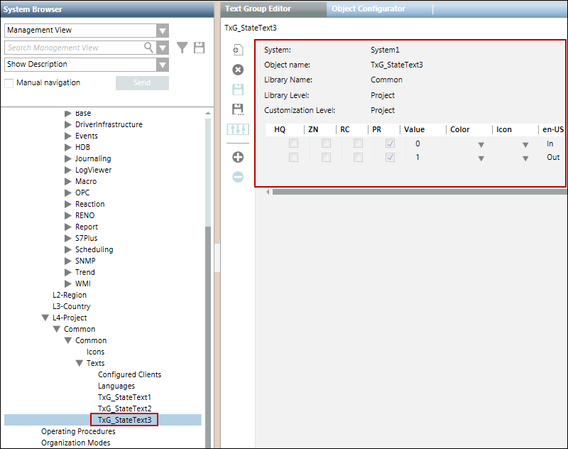 After importing the CSV for such a point, its text group is also added to the list of text groups. The following image displays the Text Group Editor showing the three state texts.