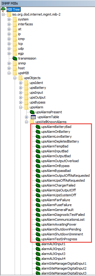 - For this integration only the alarming for the first 24 UpsWellKnownAlarms from the standard RFC1628 MIB file is supported, as highlighted in red in the following figure: