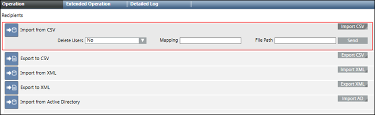The Import tab allows the user to import recipients from XML and CSV files and a department consisting of recipient users from an Active Directory.