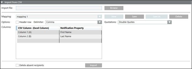 • Import: Starts the recipient user import from the selected CSV file based on the configured mapping.