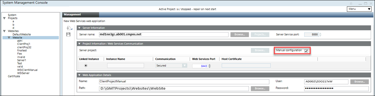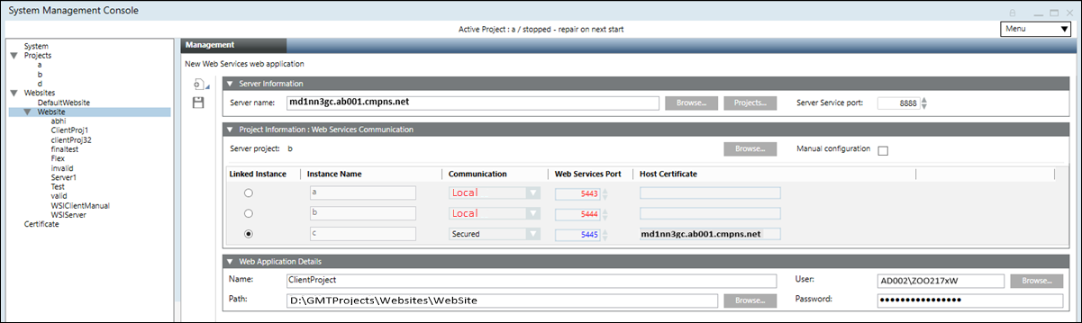 , you must provide in the web application details and the server details, including those of the project that you want to connect to.