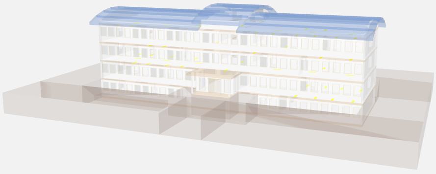 A huge amount of highly detailed data volumes are generated when comprehensively planning with BIM. The scope can impact the performance of Desigo CC. As a consequence, we recommend setting the scope of data for import in advance in consultation with the general contractor. For example, for blinds in BIM, all slats (∽30) for a window are individually referenced. In Desigo CC, the position and angle are evaluated using a reduced number of slat objects (∽8) to simplify the graphical depiction.