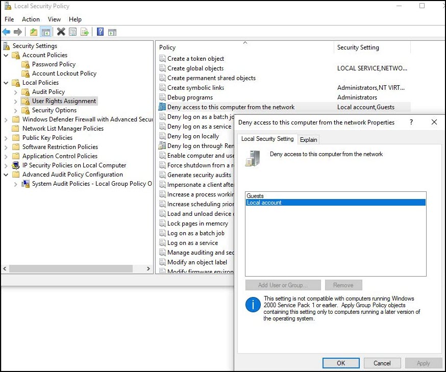 - Make sure that your Local security policy allows local accounts to access network. If the local account is denied access as shown in the image below, specify a user in the json file with proper access rights for website: