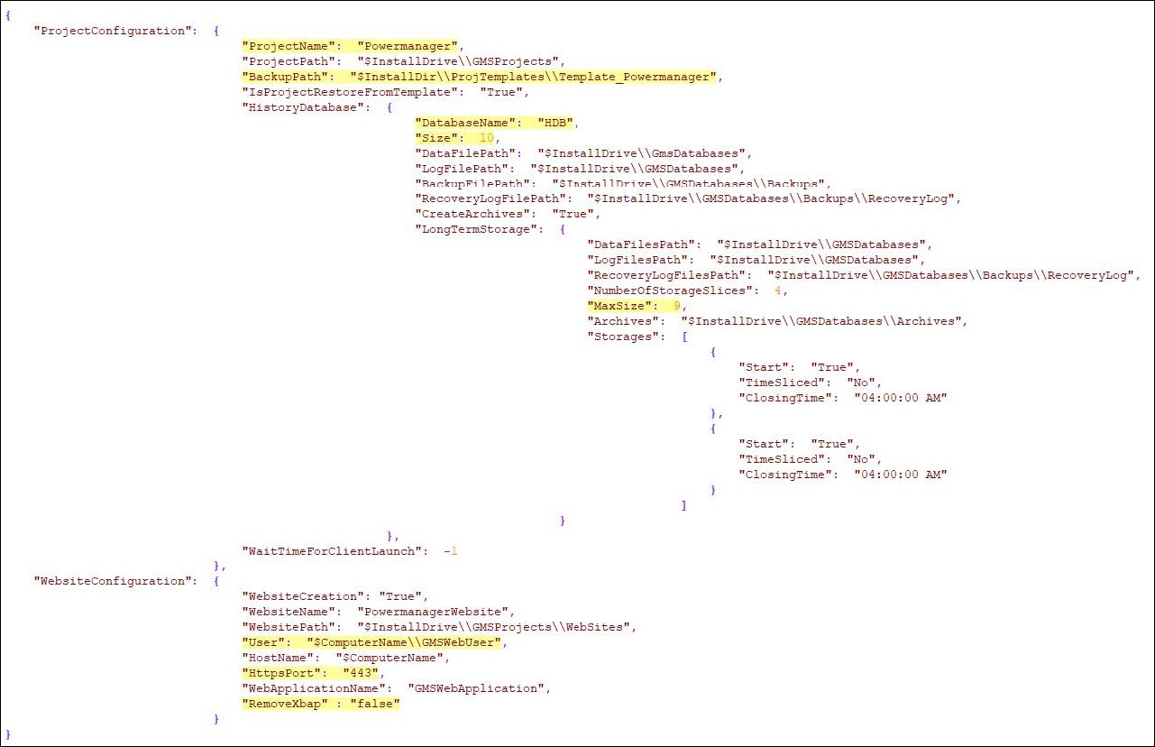 - Change the project name from "Powermanager” to appropriate value if required: "ProjectName": "Powermanager"
