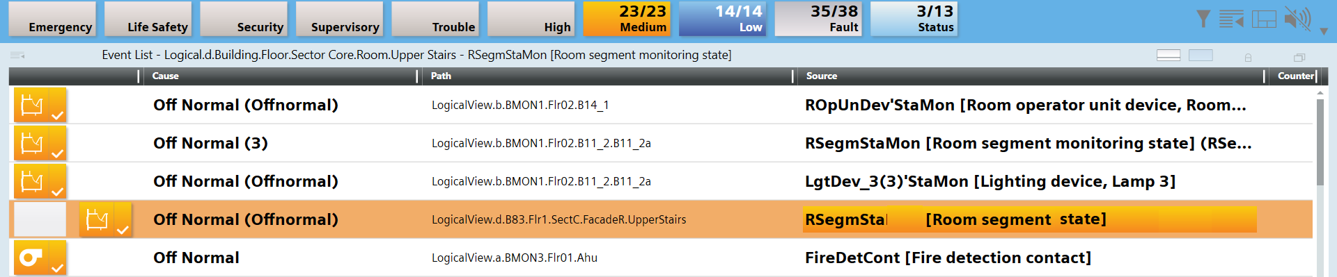 • The Common Event view is displayed. All the alarms in this segment are displayed. NOTE: There are situations, however, where the Common Event view cannot be opened directly. In this case, you must select the object [RSegmSta] Room segment status.