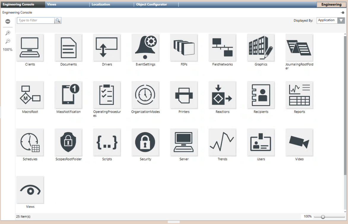 The application view of the Engineering Console provides a flat grid of icons for quickly navigating to the most commonly used configuration applications.
