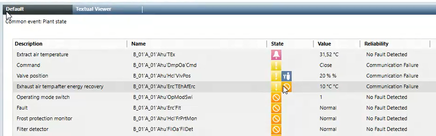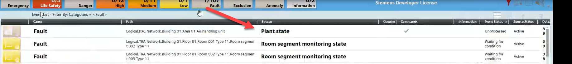 Scenario: A fault occurs in a plant that is recognized by the system with the Common Event object and is displayed in the Summary Bar. All faults belonging to the plant are listed in the Common Event view that are not triggered via an intrinsic alarm.