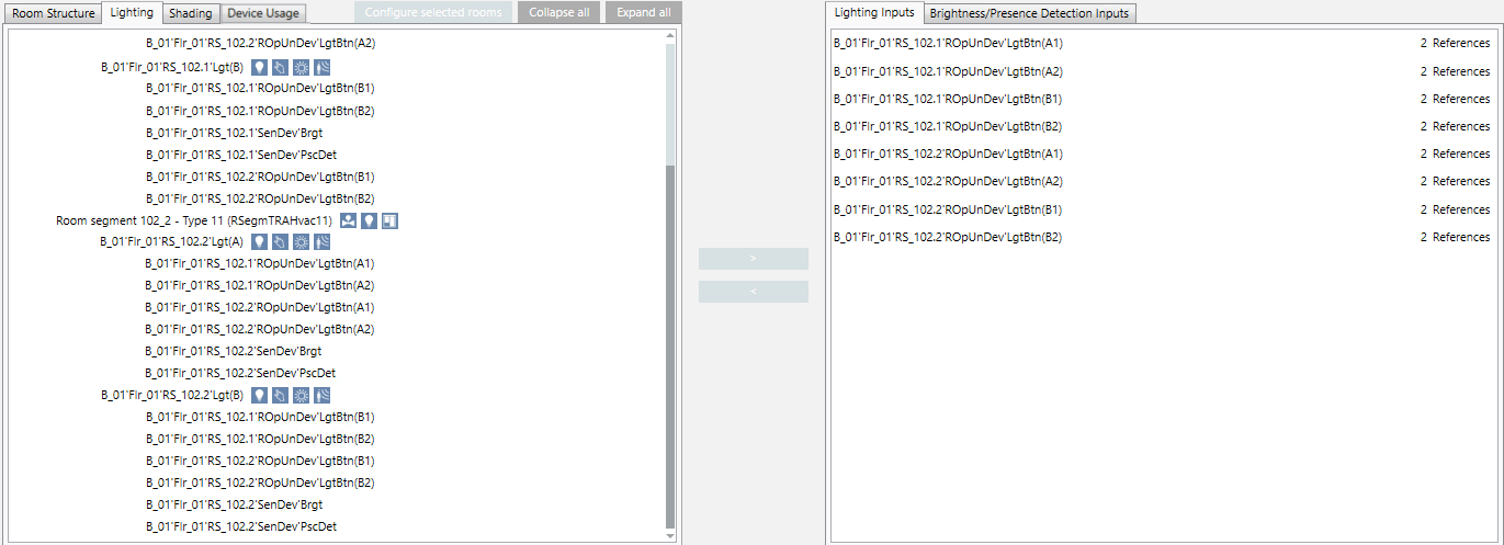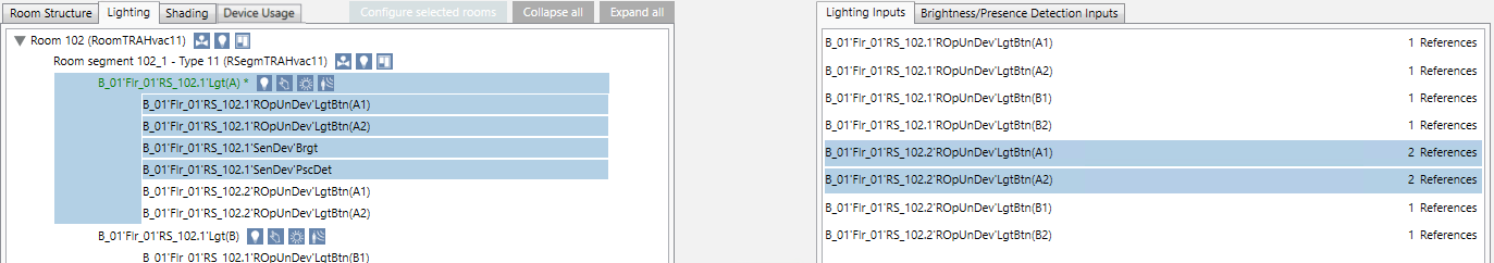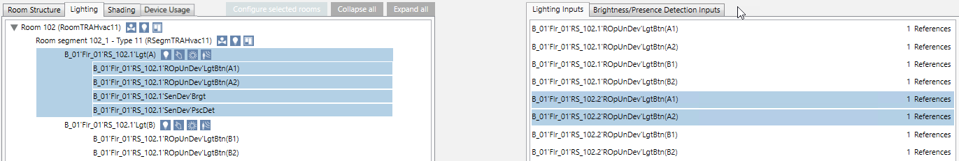 1. Highlight lighting inputs RS_102.2’ROpUnDev‘LgtBtn(A1) and Lgt RS_102.2’ROpUnDev‘LgtBtn(A2). Note that you must perform the assignment in both directions (from segment 1 to segment 2 and from segment 2 to segment 1).