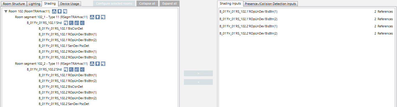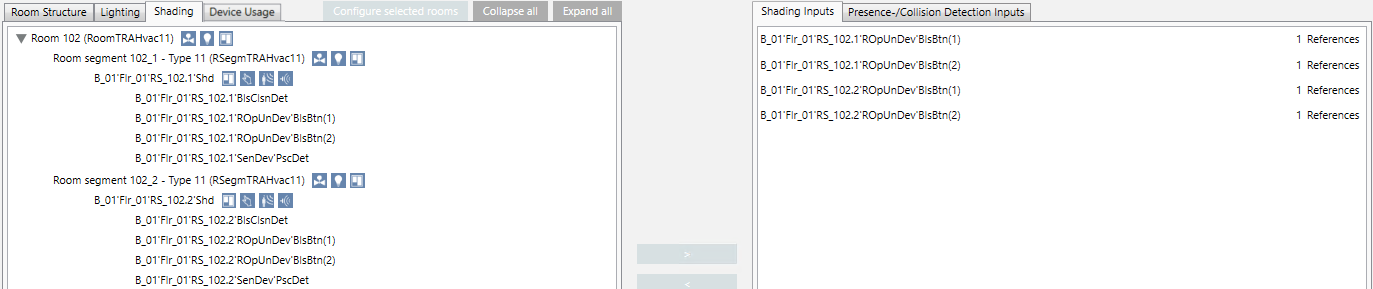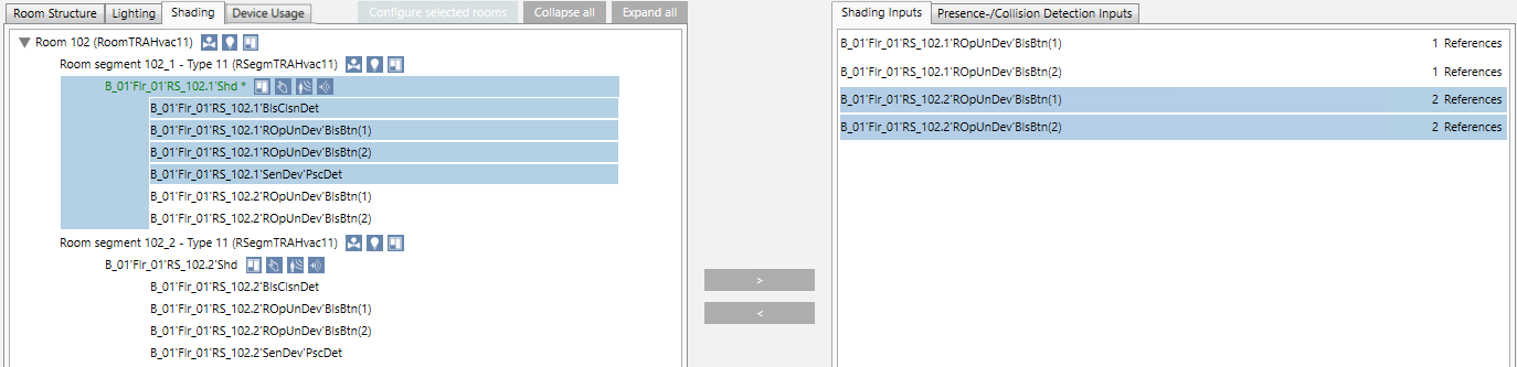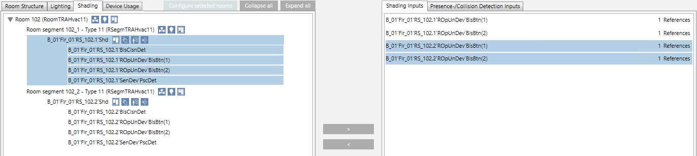 1. Highlight the shading inputs RS_102.2‘ROpUnDev‘BlsBtn(1) and RS_102.2‘ROpUnDev‘BlsBtn(2). Note that you must perform the assignment in both directions (from segment 1 to segment 2 and from segment 2 to segment 1).