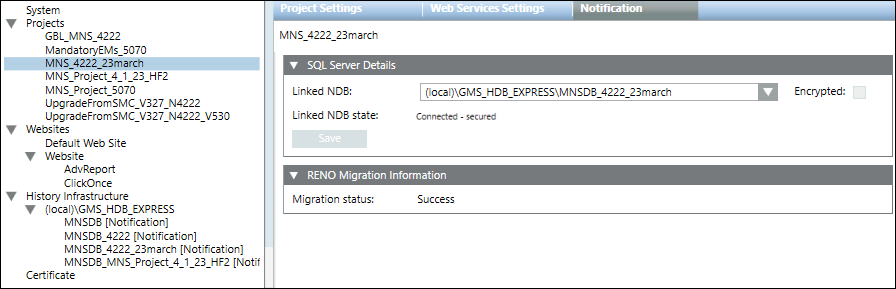 Once the project is upgraded, the migration status displays in the Notification tab in SMC under the RENO Migration Information expander as follows.