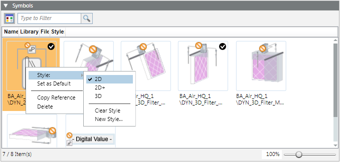 - To define the library style, right-click the desired symbol and select Style: > 2D, 2D+ or 3D.