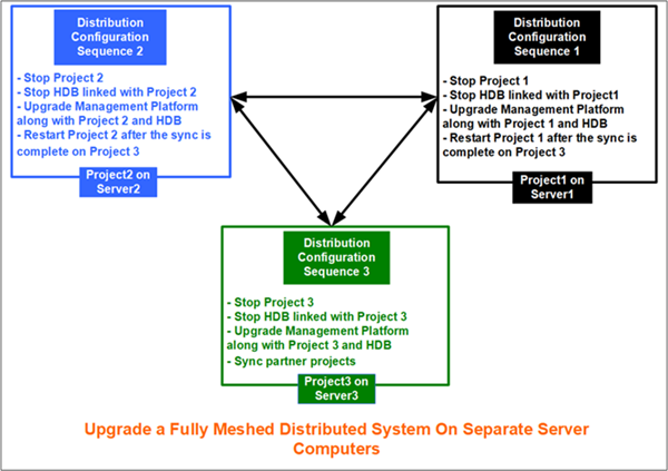 You want to upgrade an existing fully meshed distributed system deployed on 3 separate systems (for example, Server 1, 2 and 3) to the latest version.