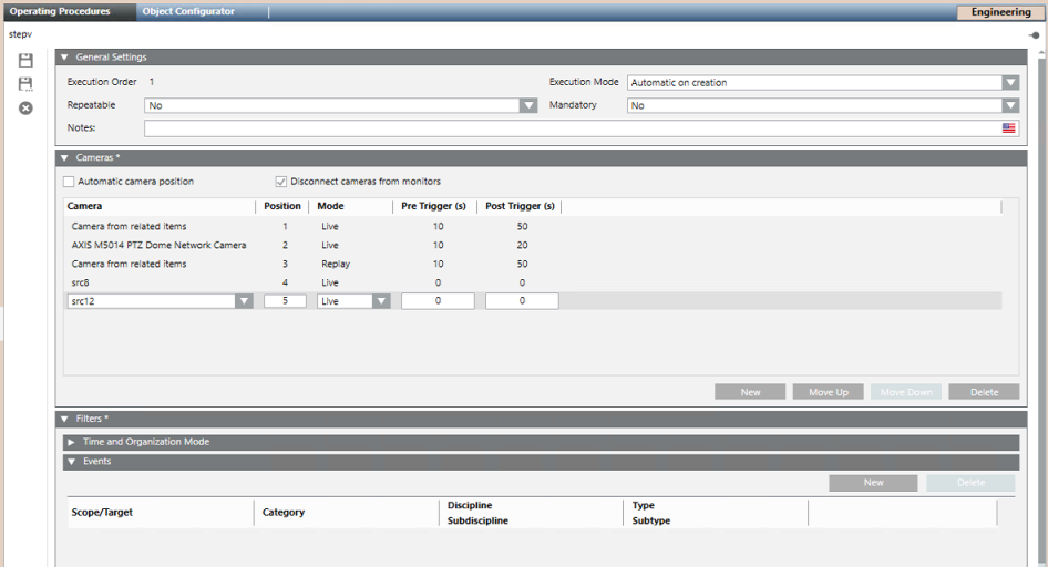 In System Browser, when you select the video step of an operating procedure, the Cameras expander lets you configure the cameras that will display live/recorded video when the video step is executed. In the Camera list you can choose to display the 'related item' cameras associated to the point in alarm, as well as other cameras that you link explicitly.
