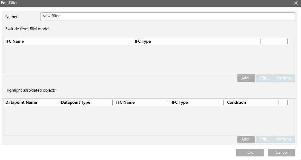 Scenario: Set up empty filters for subsequent filter configuration. You can do this later per customer requests. Typical filters include: Wall, doors, furniture, radiators, lighting, etc..