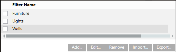 Export the new filters as described in section Exempt from BIM model for reuse on another project since all filters are always exported.