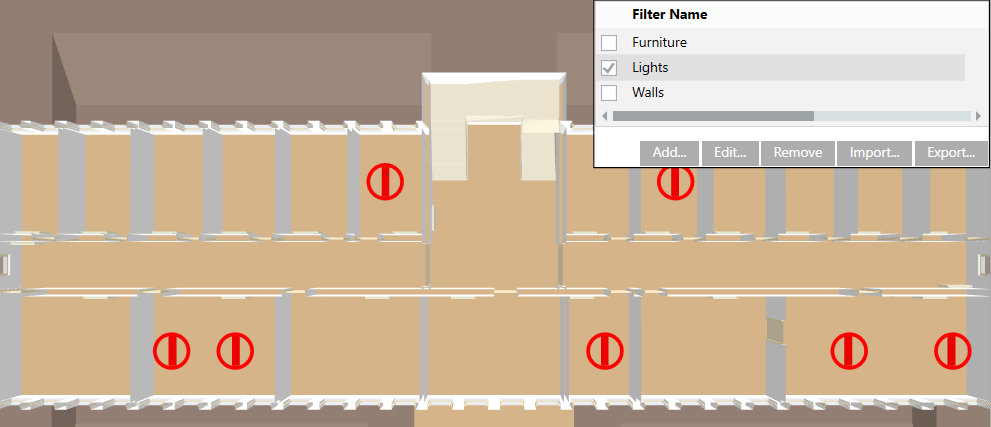 Scenario: Highlight all switched-on lighting objects in color and hide the furniture.