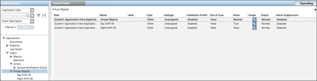 - Select Applications> Logics > Virtual Objects in the System Browser and then create virtual binary objects namely, Day Shift VB and Night Shift VB. (For more information, refer to Virtual Objects topic).
