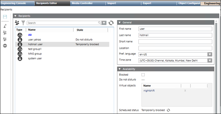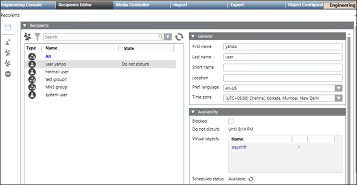 - In the Day_shift recipient group, under the Availability expander, drag and drop the created Day Shift VB in the Virtual objects section.