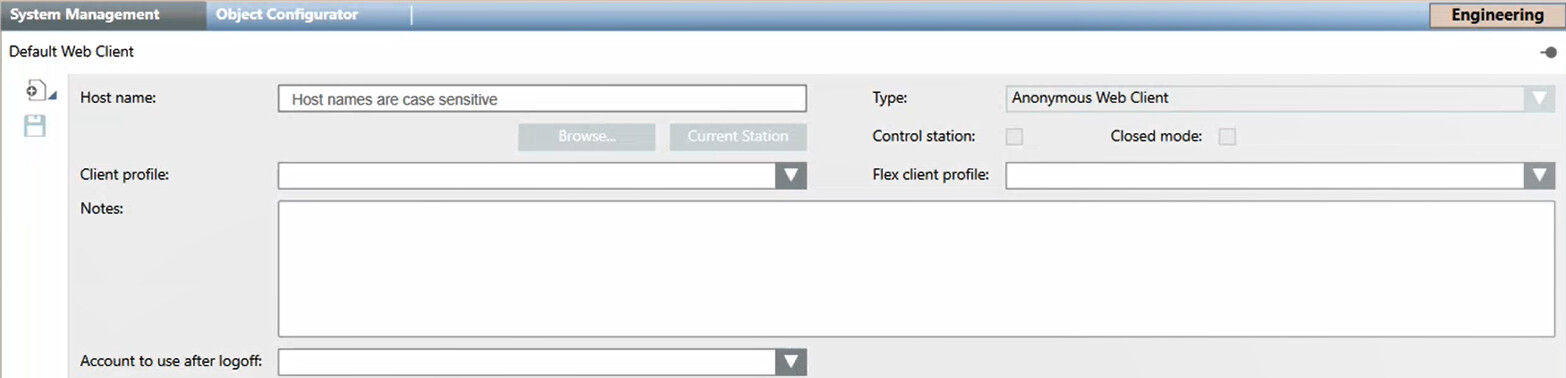For anonymous Flex stations, the settings are determined by the Default Web Client object. This means that you can have multiple anonymous Flex stations, but they will all collectively share the settings (Flex client profile, Scope, Event and Application Rights, enable/disable logon) that you define here for the Default Web Client.