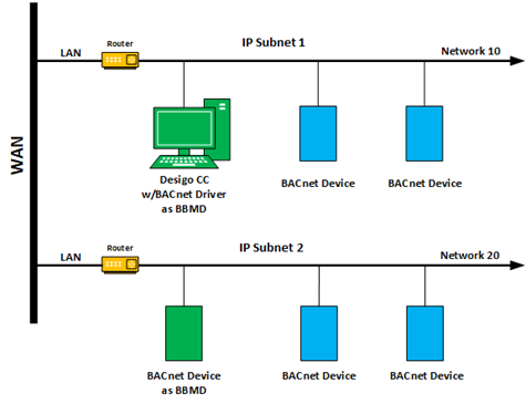 If you want the BACnet server to communicate with a BACnet network on a different subnet, you must have a BBMD configured on each subnet. Since the BACnet server cannot be a BBMD, you must configure other devices as the BBMD. For example, you could configure the BACnet driver on the Desigo CC management station to be a BBMD on the segment that the BACnet server is on and then configure a device on the other segment to be a BBMD. There can be only one BBMD per network segment.