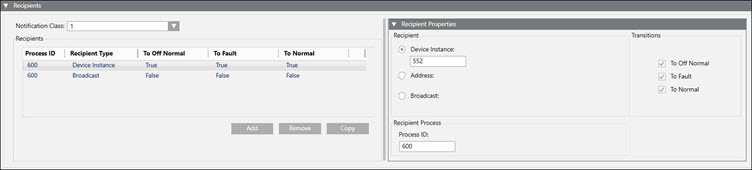 Process ID: The number entered in the Process ID field. Recipient Type: The device receiving alarms and alarm acknowledgements. Transitions: Lists the alarm states To-Offnormal, To-Fault, and To-Normal. |