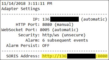 In the last line of the file, copy the SORIS Address. Example: NOTE: To enter a URL other than the default, follow the instructions in the Configure Adapter Windows Service topic that follows.