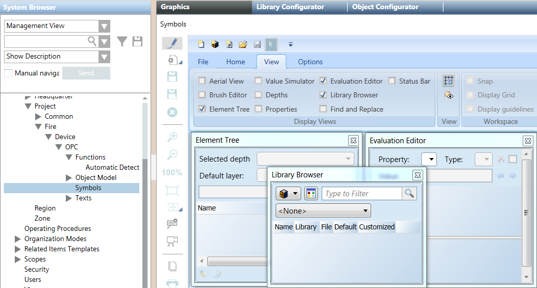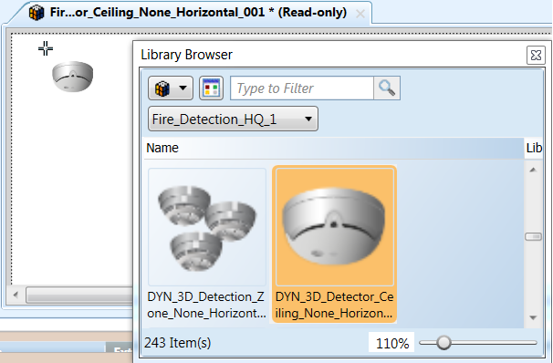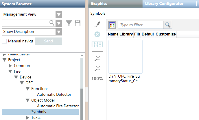 In the Library Browser view, proceed as follows (see Figure Selection of a Fire Symbol): a. Select the fire detection library (for example, Fire_Detection_HQ_1). b. Select a symbol with dynamic background (make sure the name begins with DYN_3D). c. Right-click the symbol and select Edit.
