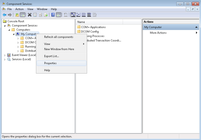 - In the Component Services window, under Console Root, expand Component Services, and expand the Computers folder.