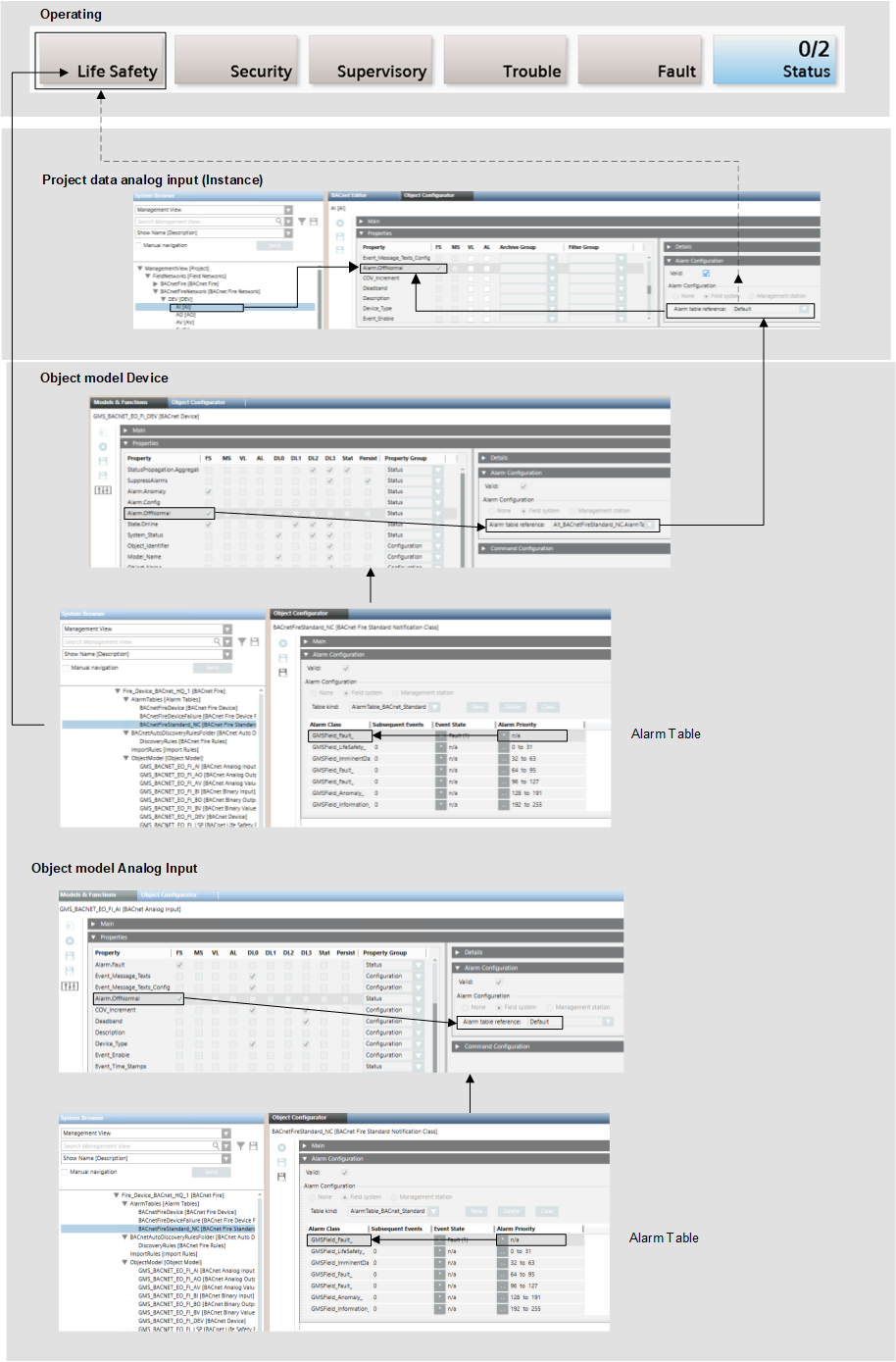 The example displays how an alarm is configured in Desigo CC to display the corresponding event on the Summary bar. In particular, the configuration of the Alarm.OffNormal property is based on the BACnetFireStandard_NC alarm table. This is linked on the device object and used as default by all the other objects, with the exception of the LifeSafetyPoint (LSP) and LifeSafetyZone (LSZ) objects that are based on the BACnetFireDevice alarm table.