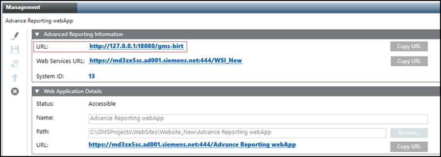 - The selected Advanced Reporting web application is upgraded. If you are upgrading the Advanced Reporting web application to V7. 0 from any version, Tomcat URL changes to http://127.0.0.1:18080/gms-birt.