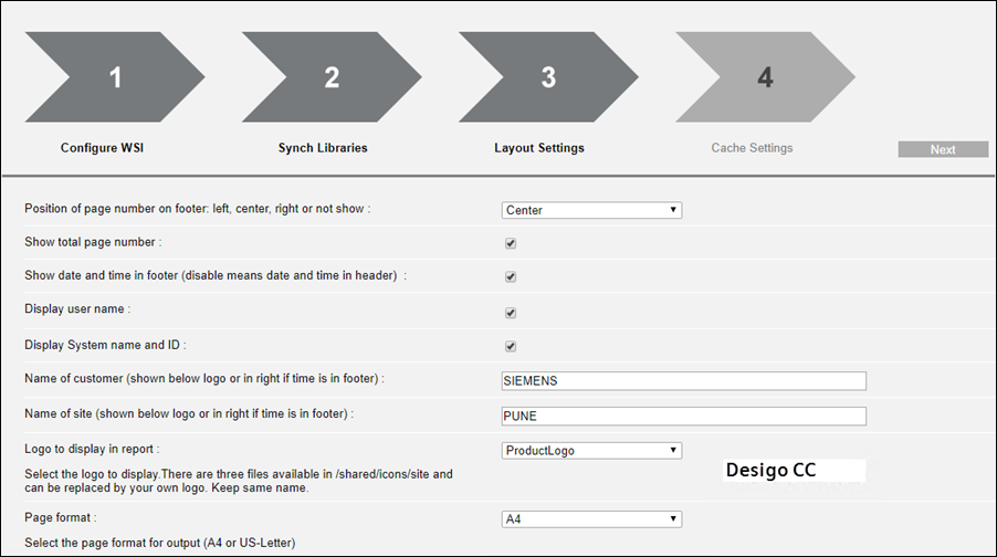 In the Layout Settings page of the wizard, specify the values for the position of the page number, the current page number with the total number of pages in the report or just the current page number, date/time when the report is generated, display user name, display system name and ID, name of the customer, name of the site, the logo to be displayed on the report, and the page format for output.