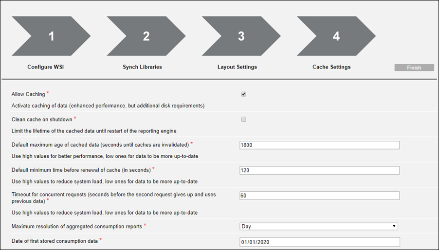NOTE: If Energy Reporting extension is added to the project, then in the Cache Settings page, you must also specify the values for the maximum resolution of aggregated consumption reports, and the date from when the consumption data is stored.