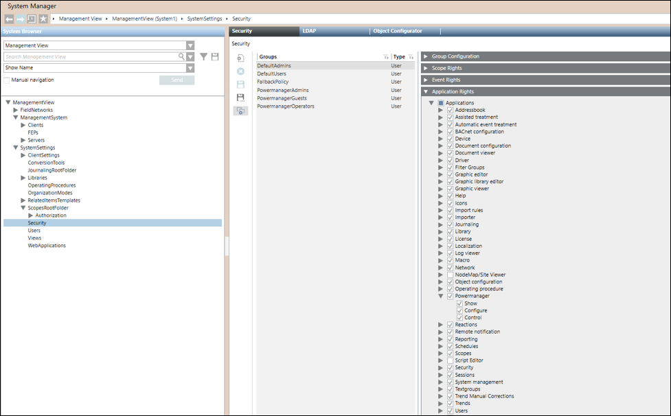 To verify rights navigate to Security tab, that displays when you select Project > System Settings > Security in the System Browser in the Engineering mode.
