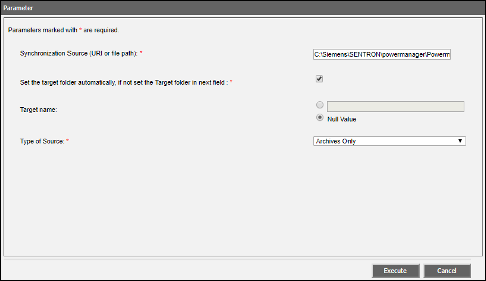 To perform the templates synchronization for Advanced Reporting, do the following: a. In the Configuration Page - Advanced Reporting, click Details adjacent to Template Synchronization. b. In the section now visible above, click Add. c. The Parameter dialog box for template synchronization displays. d. In the Synchronization Source (URL or file path) field, enter the path to the libraries folder of your project. For example, [Installation Drive]:\[Installation Path:]\[Project Name]\libraries. e. Ensure the Set the target folder automatically, if not set the Target folder in next field check box is selected to automatically set the ID of the system as the name of the folder where the advanced reporting templates will be extracted on the Tomcat server. Alternatively, to manually enter the System ID, deselect the check box and then select the option button next to Target name and type the System ID. f. In the Type of Source drop–down list, retain the default Archives Only. g. Click Execute. h. Click Synchronize.