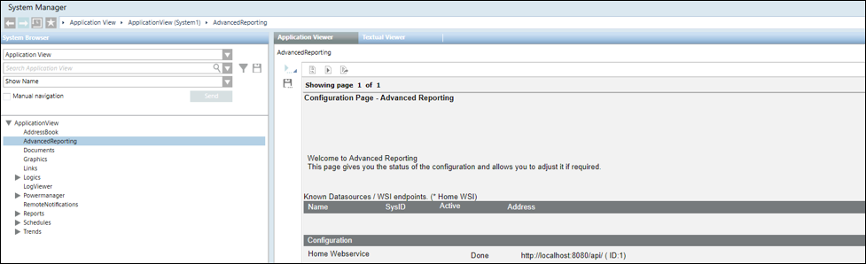 To configure the Advanced Reporting Main URL for Powermanager do the following: a. In System Browser, select Application View. b. Select Applications > Advanced Reporting. c. In the Extended Operation tab, in the Main URL Value text box, paste the copied https URL and click Set.
