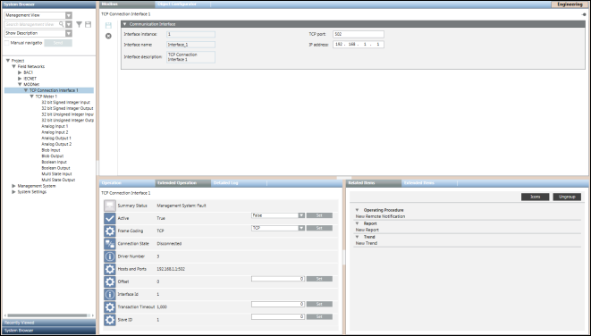 In Engineering mode, when you select a Modbus interface in System Browser its settings display in the Communication Interface expander in the Modbus tab. You can save the data or delete the Modbus interface.