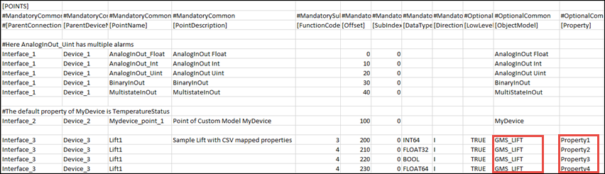 If a data point in the CSV is specified with a custom object model, then the value in the Offset field is added to the Offset specified for the property in the Import Rules. The following example illustrates this concept. Assume there are two data point declarations in the CSV: