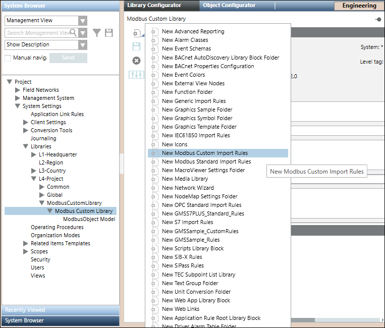 Import rules serve as mapping between the Engineering data and the Object Model configuration parameters in the management station. This requires creation of an instance of GMS_MODBUS_CustomRules in your library.