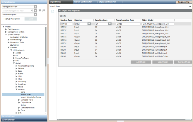 You can configure the rules for importing the object definitions for the objects of a particular Modbus family and the system data type functions associated with those objects from the Import Rules tab. You can access this tab from the Management View by navigating to Project > System Settings > Libraries > L1-Headquarter > Global > Modbus > Import Rules.